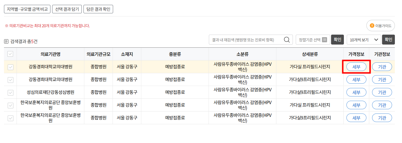 원하는 병원을 찾았다면, ‘세부 정보’ 버튼을 클릭하여 가다실 9가의 구체적인 비용 및 서비스 내용을 확인합니다.