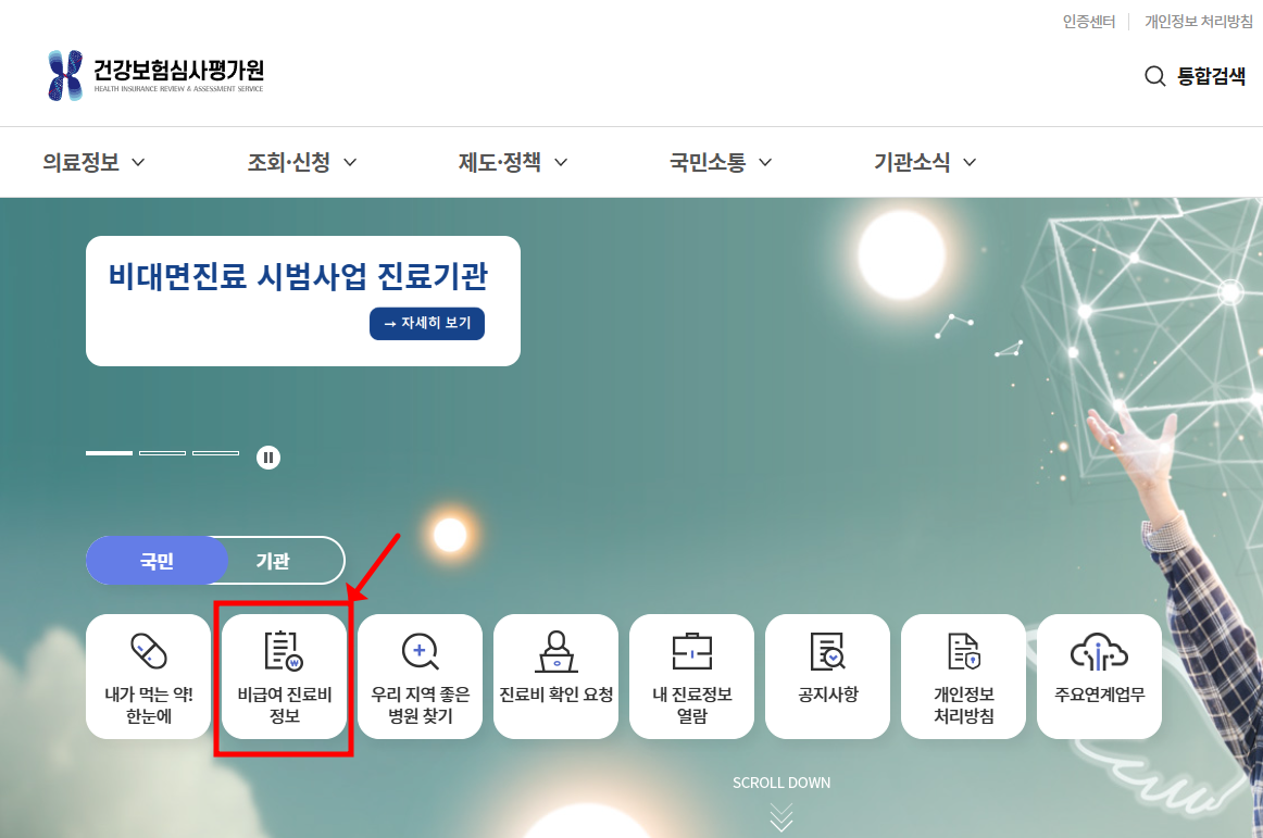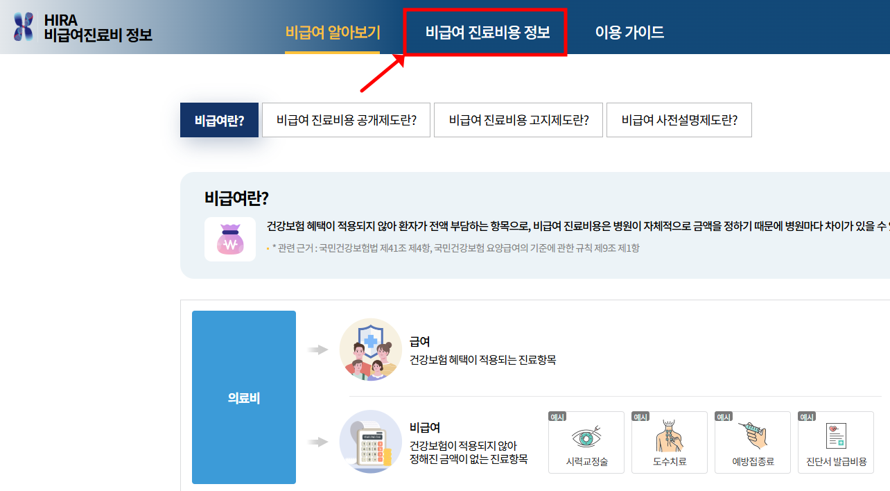 페이지 내에서 ‘비급여 진료비용 정보’를 선택