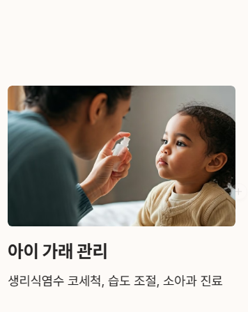 A. 생리식염수로 코 세척을 해주고 실내 습도를 조절해주세요. 증상이 심하면 꼭 소아과 진료를 받아보세요.