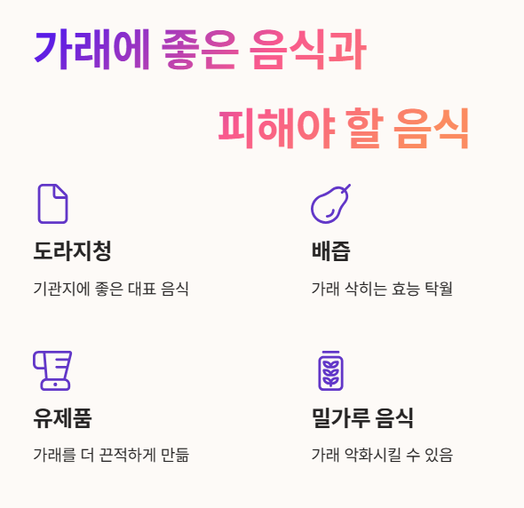 - 유제품, 밀가루 음식 등은 가래를 더 끈적하게 만들 수 있으니 주의해 주세요.