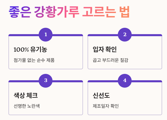 - 입자가 곱고 색이 선명한 노란색을 띠는 제품이 신선하고 품질이 좋을 가능성이 높습니다.
