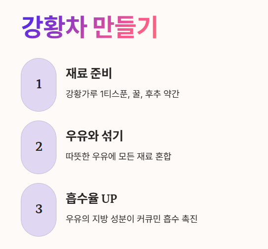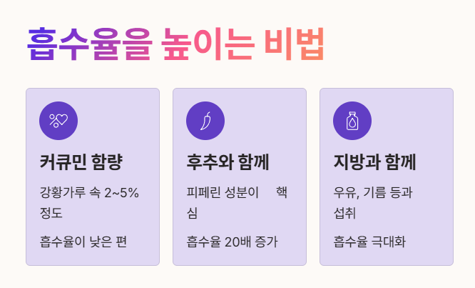- 특히 우유와 함께 마시면 지방 성분 덕분에 커큐민 흡수율이 높아진답니다. 🥛