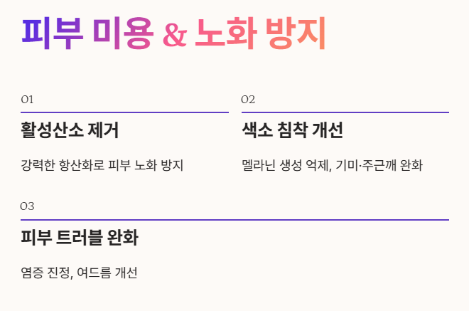 - 강력한 항산화 작용으로 활성산소를 제거해 피부 노화를 막아줘요. ✨