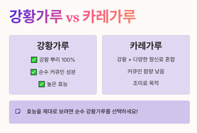 - 강황가루는 강황 뿌리 100%를 갈아 만든 것이고, 카레가루는 강황가루에 여러 가지 다른 향신료를 섞어 만든 제품이에요.