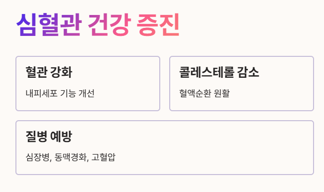 - 콜레스테롤 수치를 낮추고 혈액순환을 원활하게 하여 심장병, 동맥경화, 고혈압 예방에 도움을 줍니다. ❤️