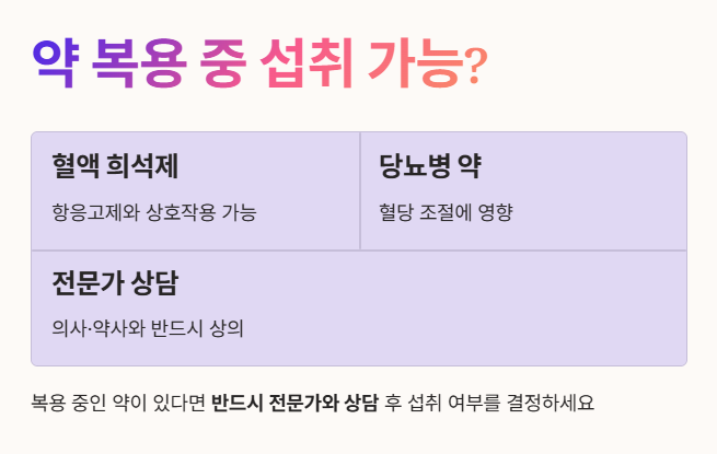 - 혈액 희석제(항응고제)나 당뇨병 약을 복용 중인 경우, 약효에 영향을 줄 수 있으므로 반드시 담당 의사나 약사와 상담한 후에 섭취 여부를 결정해야 합니다.