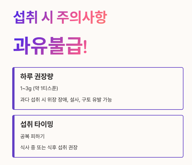 - 과다 섭취 시 위장 장애, 설사, 구토 등을 유발할 수 있어요. 😵