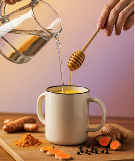 - 따뜻한 물이나 우유에 강황가루 1티스푼과 꿀, 후추를 약간 섞어 마시면 좋아요.