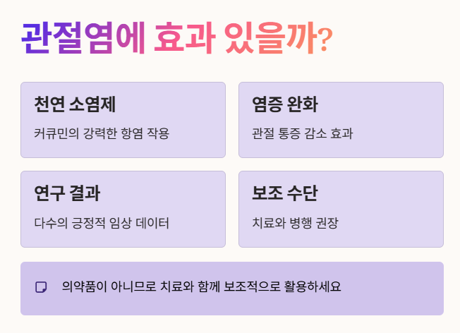 - 강황의 커큐민 성분은 강력한 천연 소염제 역할을 하여 관절의 염증과 통증을 완화하는 데 도움을 준다는 연구 결과가 많습니다.