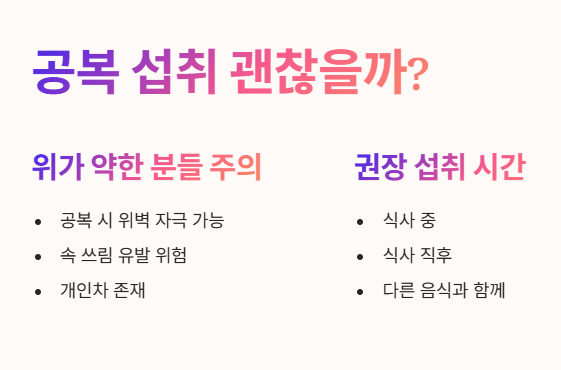 - 위가 약한 분들은 공복에 섭취 시 위벽을 자극해 속 쓰림을 유발할 수 있어요.