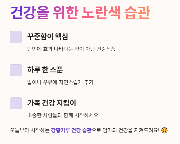 강황가루는 단번에 효과가 나타나는 약이 아니라, 꾸준히 섭취할 때 빛을 발하는 건강식품이에요.