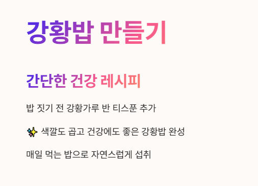- 밥을 지을 때 강황가루를 반 티스푼 정도 넣으면 색깔도 곱고 건강에도 좋은 강황밥이 완성돼요. 🍚