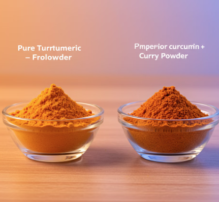 - 강황가루는 강황 뿌리 100%를 갈아 만든 것이고, 카레가루는 강황가루에 여러 가지 다른 향신료를 섞어 만든 제품이에요.