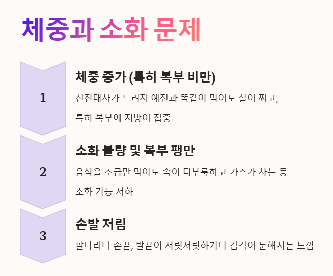 - 신진대사가 느려져 예전과 똑같이 먹어도 살이 찌고, 특히 복부에 지방이 집중되는 경향이 있어요. 뱃살이 늘어나죠. 😭