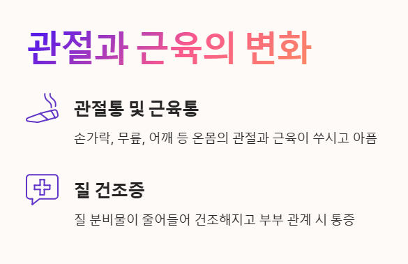 - 질 분비물이 줄어들어 건조해지고, 이로 인해 부부 관계 시 통증을 느낄 수 있어요.