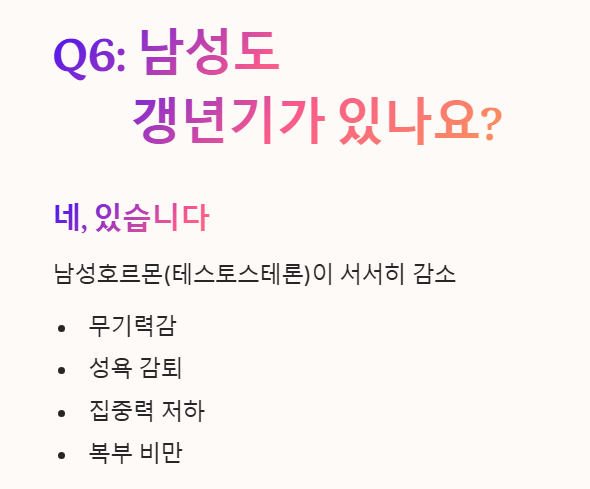 - 여성처럼 급격한 변화는 아니지만, 남성도 나이가 들면서 남성호르몬(테스토스테론)이 서서히 감소하여 무기력감, 성욕 감퇴, 집중력 저하, 복부 비만 등의 증상을 겪을 수 있습니다.
