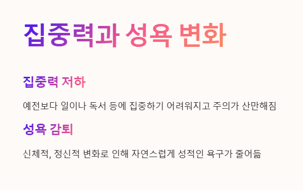 - 신체적, 정신적 변화로 인해 자연스럽게 성적인 욕구가 줄어들 수 있습니다.