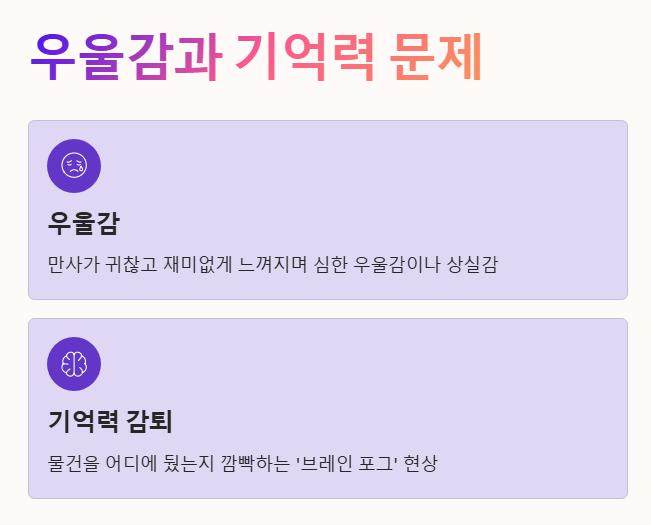 - 물건을 어디에 뒀는지 깜빡하거나, 방금 하려던 말을 잊어버리는 '브레인 포그(Brain Fog)' 현상이 나타나요.