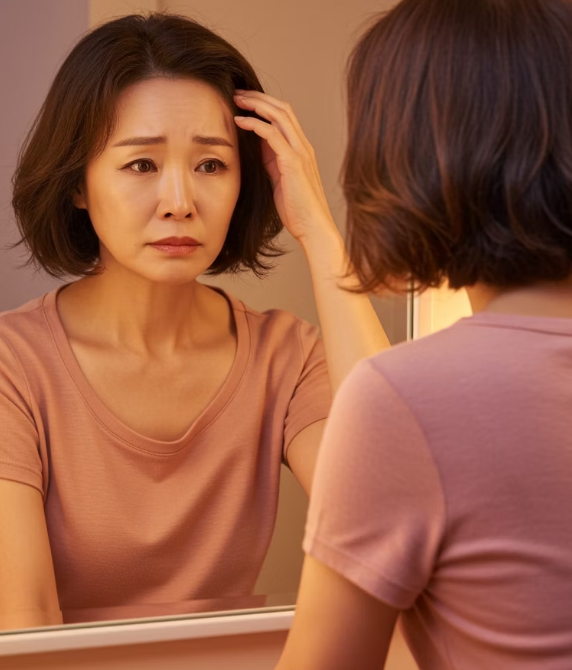 - 머리카락이 예전보다 많이 빠지고 가늘어지는 것을 느끼게 됩니다.