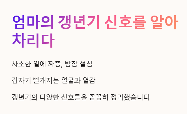 엄마도 저도 갱년기에 대해 막연하게만 알고 있었지, 이렇게 다양한 신호를 보내는지는 전혀 몰랐답니다. ✨
