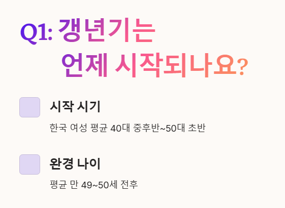 • 개인차가 있지만, 한국 여성의 경우 평균적으로 40대 중후반에서 50대 초반에 시작됩니다. 👩‍🦰