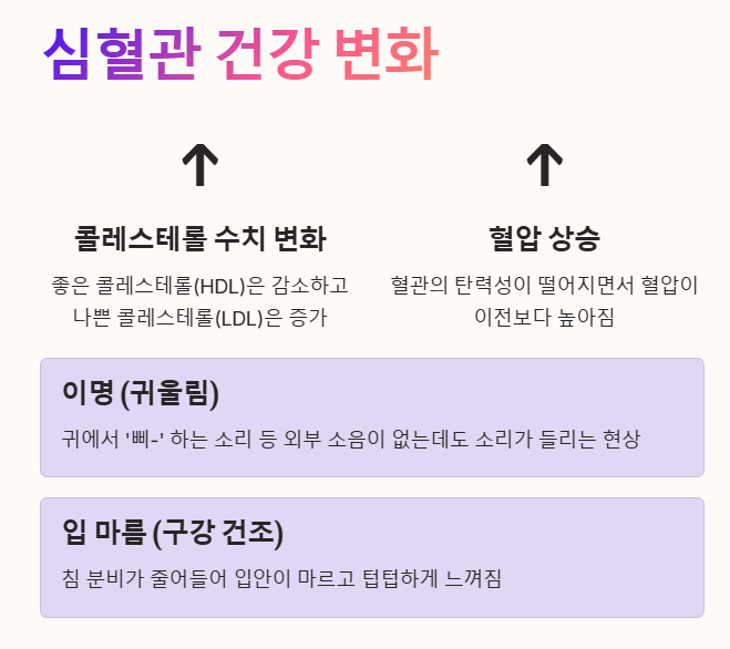 - 혈관의 탄력성이 떨어지면서 혈압이 이전보다 높아질 수 있습니다.