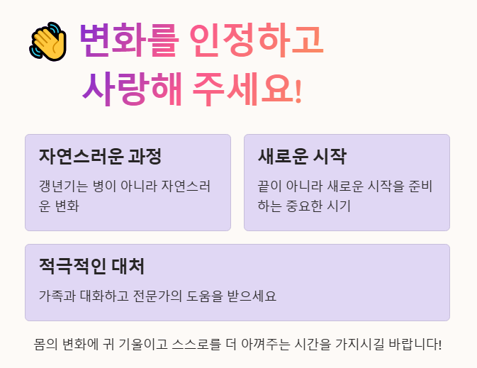 갱년기는 끝이 아니라, 새로운 시작을 준비하는 중요한 시기랍니다. 🏃♀️