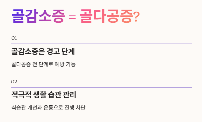 - 골감소증은 골다공증으로 가기 전의 '경고' 단계라고 생각하시면 돼요.