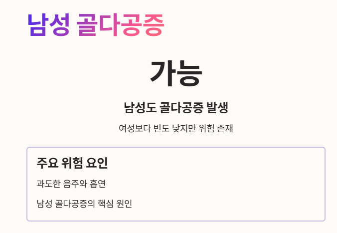 - 과도한 음주와 흡연은 남성 골다공증의 주요 위험 요인이므로 각별한 주의가 필요합니다.
