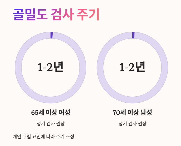 - 일반적으로 65세 이상 여성과 70세 이상 남성은 1~2년에 한 번씩 정기적으로 검사를 받는 것이 권장됩니다.