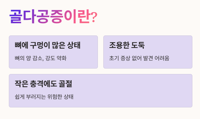 골다공증은 말 그대로 '뼈에 구멍이 많은 상태'를 의미해요.