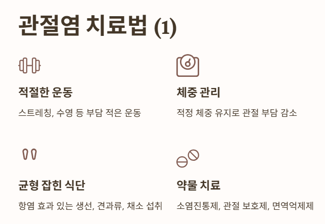 관절염은 완치가 쉽지 않지만, 증상을 완화하고 진행을 늦추는 다양한 방법이 있어요.