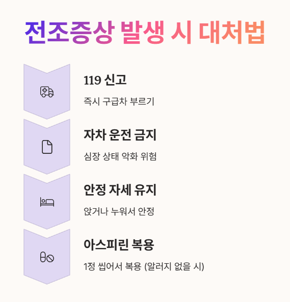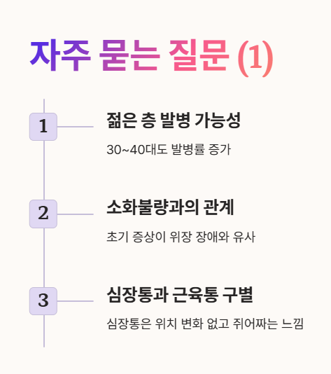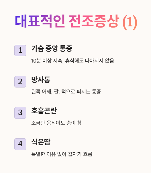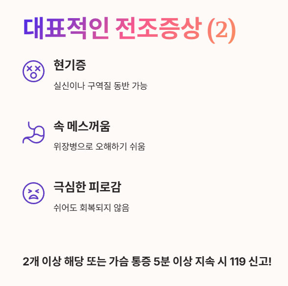 👉 이 중 2개 이상 해당되거나, 가슴 통증이 5분 이상 지속된다면 즉시 119를 부르셔야 해요!