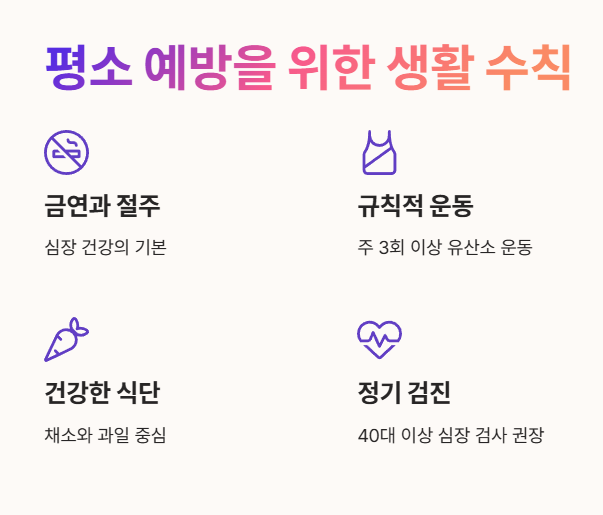 - 정기 건강검진 (특히 40대 이상은 심장 관련 정밀검사 추천)
