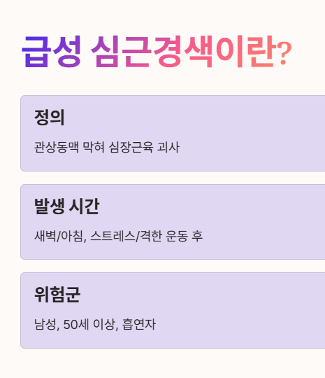 급성 심근경색은 심장 근육에 혈액을 공급하는 관상동맥이 갑작스럽게 막히면서 심장 근육이 괴사하는 질환이에요. 보통 심장마비라고도 알려져 있는데, 이 상태가 지속되면 심각한 합병증이나 사망으로 이어질 수 있어요.