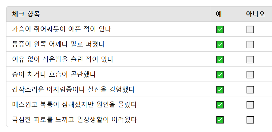 이 일을 계기로 저도 그렇고 제 주변 사람들도 심근경색의 전조증상에 대해 관심을 갖게 되었어요. 특히 스스로 체크해볼 수 있는 자가진단 방법이 있다면, 빠르게 대처할 수 있지 않을까 싶어 이 글을 준비하게 되었답니다. 😯