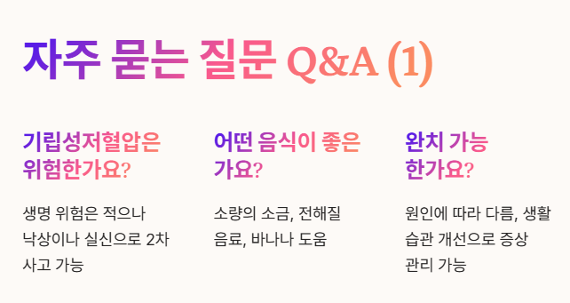 A1: 기립성저혈압 자체는 생명에 지장을 주진 않지만, 낙상이나 실신으로 인한 2차 사고가 발생할 수 있으므로 주의가 필요합니다.