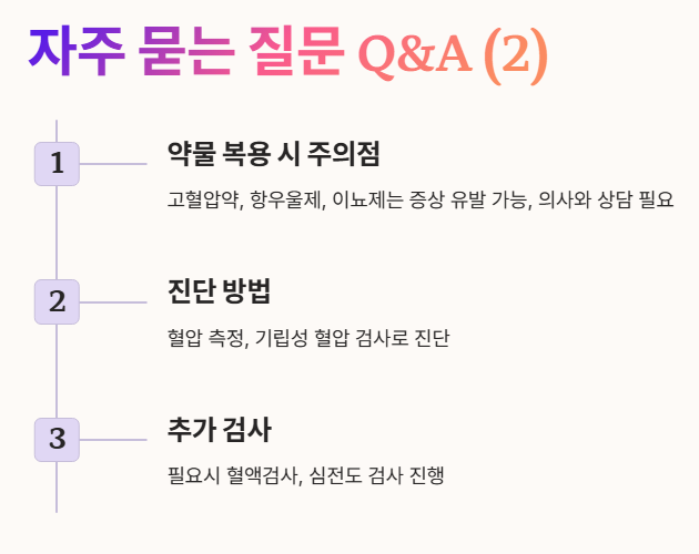 A4: 특정 고혈압 약, 항우울제, 이뇨제는 기립성저혈압을 유발할 수 있습니다. 복용 중이라면 의사와 상담이 필요합니다.