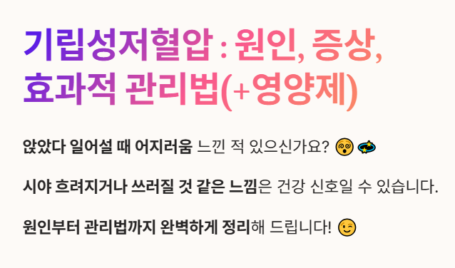이 글을 끝까지 읽으시면 기립성저혈압의 원인을 이해하고, 건강한 생활 습관과 함께 증상을 효과적으로 관리할 수 있을 거예요! 😉