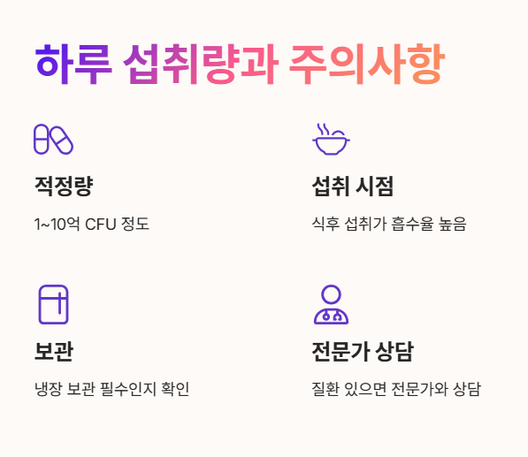 - 제품에 따라 다르지만 보통 1~10억 CFU (콜로니 형성 단위) 정도가 적정량으로 제시되고 있어요.