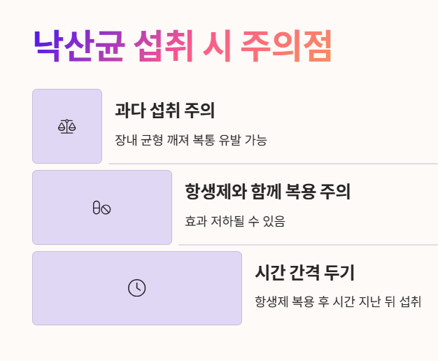 - 항생제를 복용 중이라면 낙산균 효과가 줄어들 수 있어요. 항생제 복용 후 일정 시간이 지난 뒤 섭취하는 걸 권장해요.