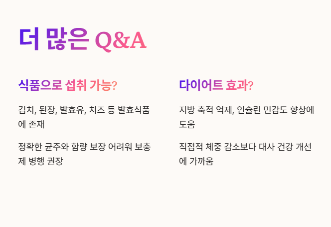 - 자연 발효 식품이나 프로바이오틱스 보충제 형태로 섭취 가능