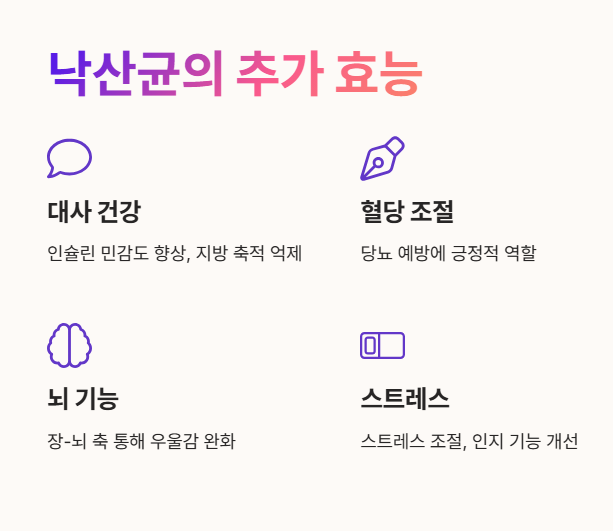 최근 연구에서는 낙산이 장-뇌 축(Gut-Brain Axis)을 통해 우울감 완화, 스트레스 조절, 인지 기능 개선에도 영향을 줄 수 있다는 결과가 나오고 있어요.