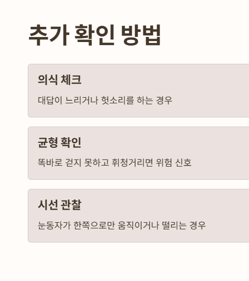 - 시선 관찰: 눈동자가 한쪽으로만 움직이거나 떨리는 경우