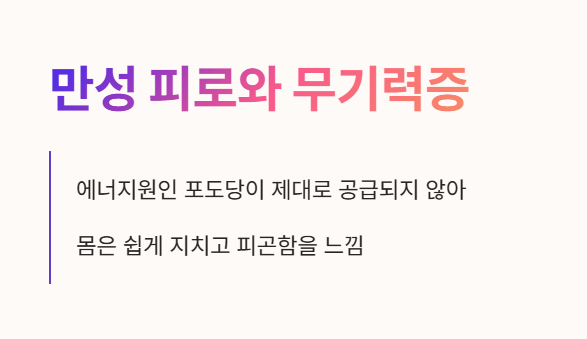 - 에너지원인 포도당이 제대로 공급되지 않으니, 몸은 쉽게 지치고 아무리 쉬어도 피곤함을 느끼게 된답니다. 😴