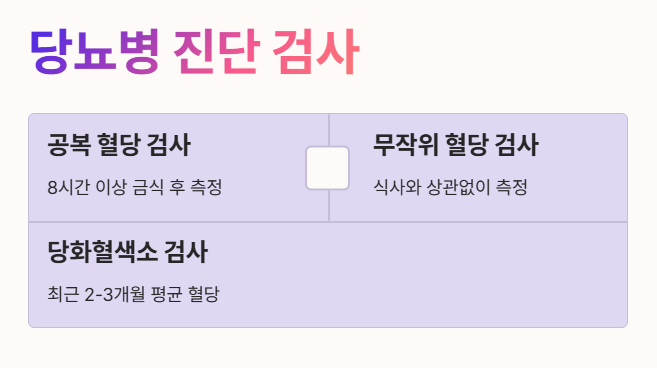 - 8시간 이상 금식 후 측정하는 '공복 혈당 검사', 식사와 상관없이 측정하는 '무작위 혈당 검사', 그리고 최근 2~3개월간의 평균 혈당 수치를 알 수 있는 '당화혈색소(HbA1c) 검사' 등이 있습니다.