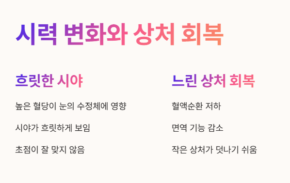 - 높은 혈당이 눈의 수정체에 영향을 주어 시야가 흐릿하게 보이거나 초점이 잘 맞지 않는 증상이 나타날 수 있어요.