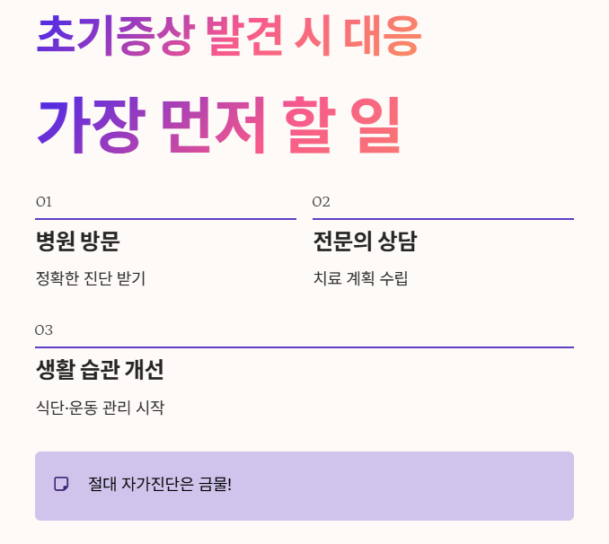 만약 위에서 언급한 초기증상들이 나타난다면, 가장 먼저 병원에 방문하여 정확한 진단을 받는 것이 중요해요. 🩺