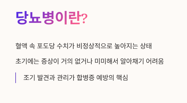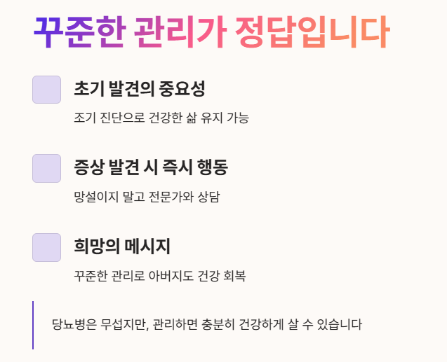 - 하지만 꾸준한 식단 관리, 운동, 약물 치료를 통해 혈당을 정상 범위로 조절하며 합병증 없이 건강하게 살아갈 수 있습니다.