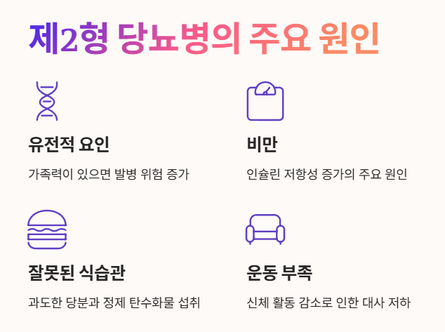 - 유전적 요인과 함께 비만, 잘못된 식습관, 운동 부족 등 환경적 요인이 크게 작용한답니다. 대부분의 당뇨병 환자가 여기에 해당해요.